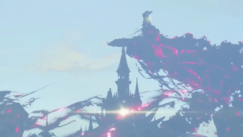 The watcher is pulled onto a grassy field overlooking Hyrule Castle. Although it is the dead of night, the castle is clearly visible, lit with an unnatural magenta glow. The sky is empty of clouds, except for the ones swirling around the castle. They circle the castle at a languid pace that belies their maleficent nature. Every so often, the clouds coalesce into a beastly shape with glowing eyes that roars in fury and agony, as though trapped in orbit by the castle's gravity.
